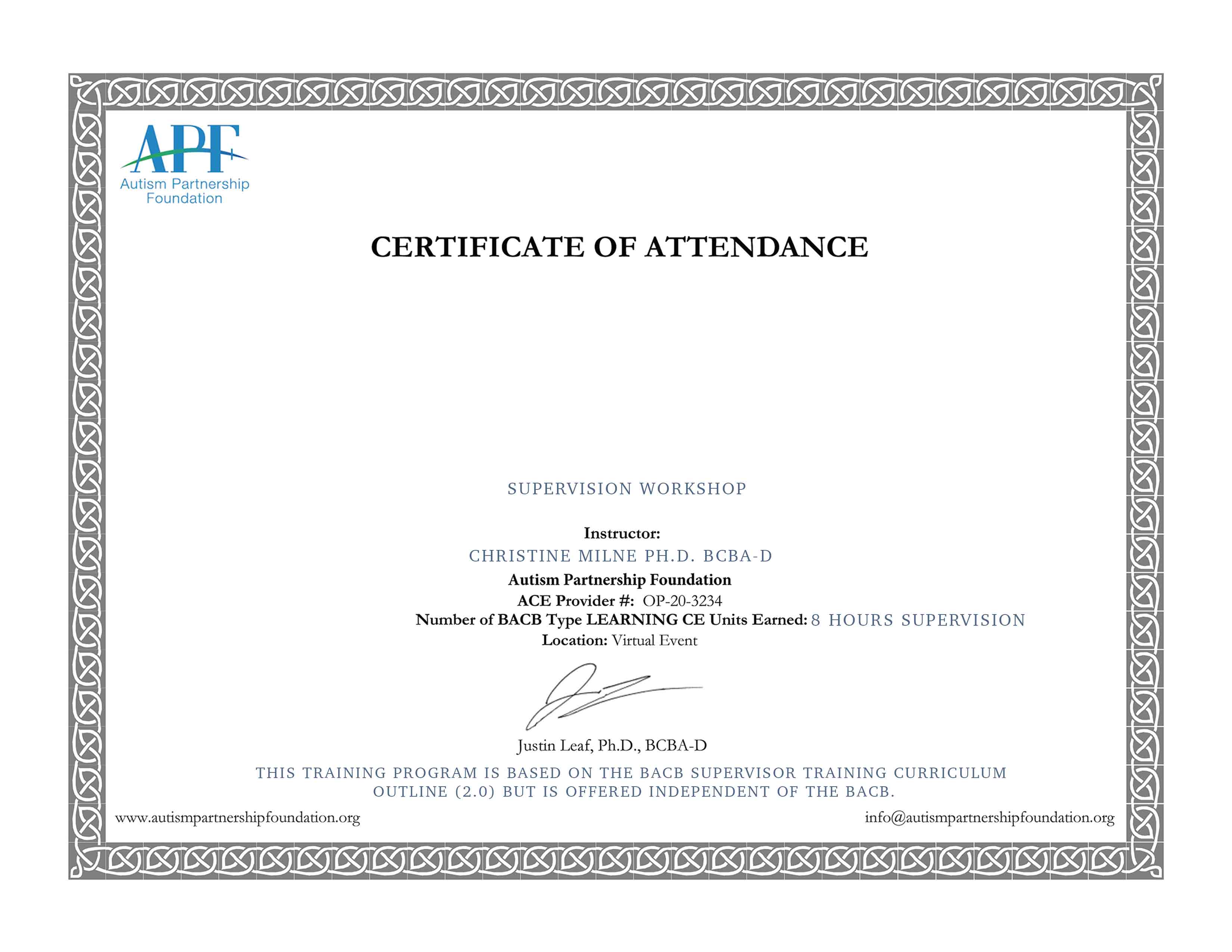 Verify the details on this certificate by visiting autismpartnershipfoundation.org/verify APF--30555-0 BCBA: Date: